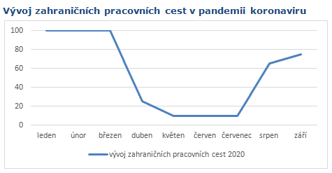 Zatímco v prvních třech měsících letošního roku byl počet zahraničních pracovních cest shodný s loňským rokem, v dubnu nastal jejich dramatický propad o 75 %. Od května do července se pak tento druh cest téměř zastavil a do zahraničí pracovně vyrazila pouhá desetina lidí. Ačkoli od srpna došlo k výraznému oživení pracovních cest, bylo jich přesto uskutečněno o třetinu méně než ve stejném období loňského roku.